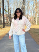 This cropped puffer jacket combines toile-inspired design with corduroy texture for a stylish, cozy look. Perfect for cooler days.